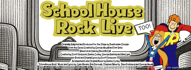 SCHOOLHOUSE ROCK LIVE TOO! is presented through special arrangement with Music Theatre International (MTI). All authorized performance materials are also supplied by MTI. www.mtishows.com